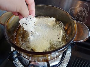 油六成热的时候放入待炸的排叉。(如何判断油是否到了六成热,将一个小面片放入锅中,冒大泡就对了)