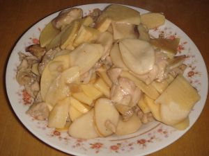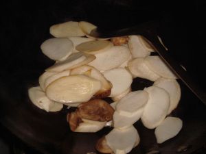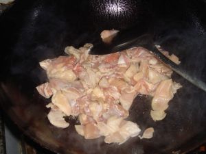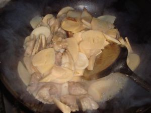 杏鲍菇炒软后放入冬笋炒一下,放入鸡片继续翻炒;
