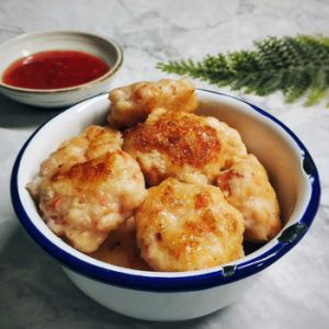 手粘水,将虾泥捏成饼形,放入不粘锅里