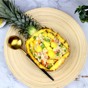 将炒好的菠萝饭盛入“ 菠萝碗”中。