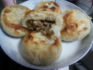 拌好的肉馅放冰箱冷藏一小时,同时处理好油皮,油酥面,(请参看其他厨师的作法),这里不再重复,把醒好的面皮包上肉馅,放烤箱烤制20~30分钟左右,视烤箱情况,待酥饼烤制外皮焦黄即可。