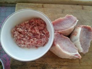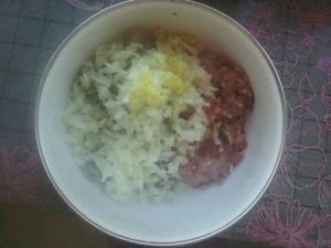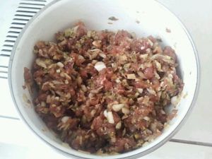 元葱切沫,槐花碎加入肉馅,加各种调料……拌匀。