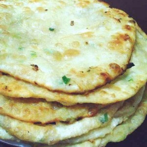 把面卷两段捏紧,然后把长面卷切成手掌宽的段,每一段都捏紧两段。取一个小面卷,竖着的方向压瘪,擀成一个薄饼。就这么把每一个都做好,拍干净多余的面粉。