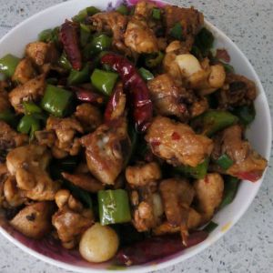 加入青椒,待青椒快至虎皮状时,加入少量小葱,调料翻炒,装盘