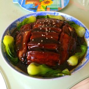 蒸好的梅菜扣肉倒扣在盘子里就是这个样子啦。