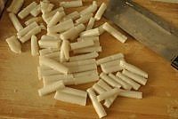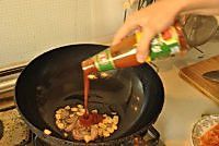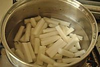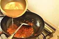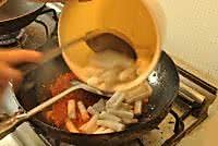 加入切碎的泡菜翻炒,然后加适量刚才煮年糕条的水。