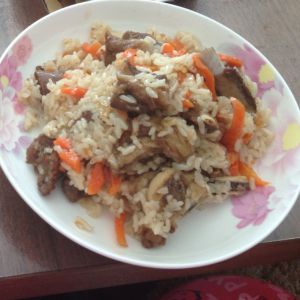 开饭时间到,打开电饭煲,将食材拌匀,好吃的新疆抓饭就做好了!