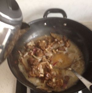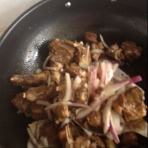 待羊排水份收干,加入洋葱煸炒