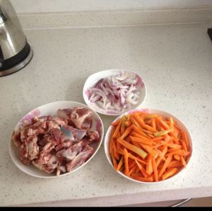 加开水煮半小时,待羊排八成熟,加盐。然后把羊排捞出放入电饭煲,大米浸泡一小时后,铺放在羊排上,用之前煮羊排的汤汁焯一下胡萝卜,最后将汤汁和萝卜一起倒进电饭煲。(煮羊排的水量要多一些,可以根据米饭的多少进行调整)