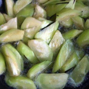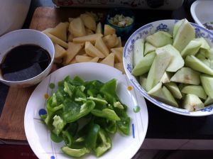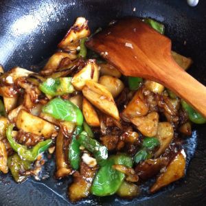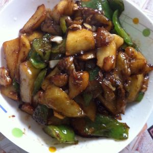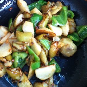 留一点底油,放入姜蒜,辣椒炒一会,辣椒断生即可,然后加入炸过的土豆和茄子迅速翻炒