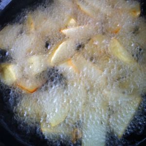 中火炸土豆快,颜色金黄用漏勺捞出备用