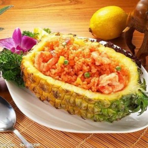 最后将炒好的菠萝饭盛入菠萝壳中,撒入黑葡萄干和熟腰果仁即可。
