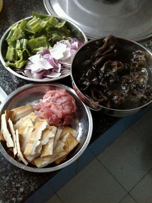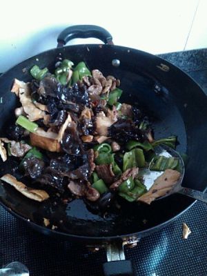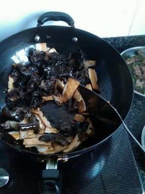 接着倒入木耳豆干洋葱一起扁炒!一定要不停翻炒,不然木耳会粘锅,还会到处乱跳!!哈哈~