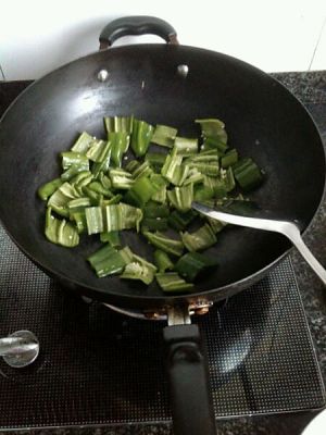 先将青椒在烧热的锅里放少许盐干焙一下直到有香味为止,盛到碗里待会再用。