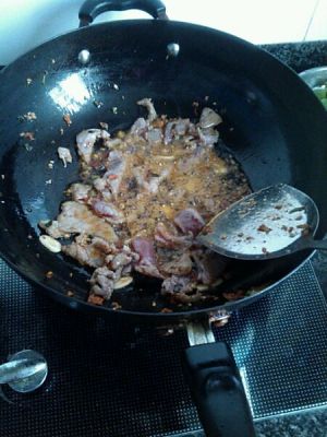 然后迅速倒入肉片翻炒,倒少许老抽上色。八分熟时盛出放入盘里,把油留在锅里!!