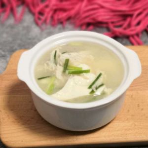 倒入适量水,加入生姜片,料酒,大火烧开,加入嫩豆腐煮一分钟
