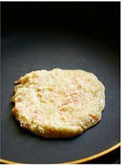 舀入一勺面糊,用勺子将面糊摊成圆饼,小火煎