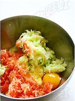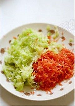 胡萝卜洗净,擦成丝。西葫芦洗净削去外皮,擦成丝