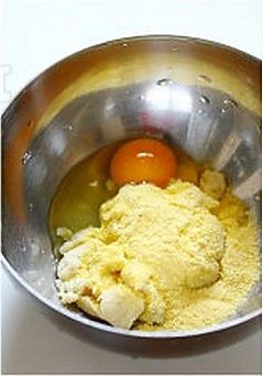将熟豆渣、玉米面混合倒入大盆中,打入鸡蛋