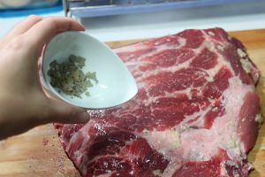 细海盐,和捣成泥的蒜均匀的涂抹在肋排上,再撒上一层现磨的黑胡椒