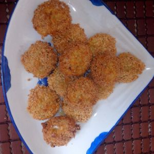 把黏好淀粉的土豆球摁扁,放入蛋液里,黏上蛋液