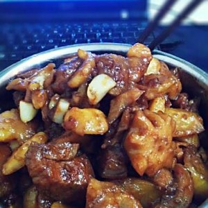 等到肉肉全部上色了,把土豆块儿和莲藕块儿放进去,一起炒一会儿。加热水,沒过菜,盖锅盖小火煮二十分钟,开盖,大火收汁,盛出来就好了。