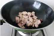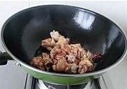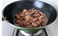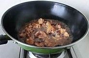 鸡肉炒至变色时加入生抽、白糖翻炒均匀,加入适量的水炖煮