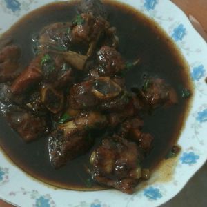 大火收滋,锅里收到少量水时加二勺糖三勺蚝油,少量的盐最后放醋三勺,如果怕烧锅的话在放糖醋时可以开小火,然后大火炒一会,记住在加糖醋时要不停的炒动排骨。