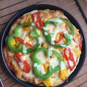 观察披萨已基本烤熟,芝士也基本融化后,拿出披萨,在披萨上平铺好青红椒圈,然后再撒上一层芝士,进烤箱烤4分钟左右,观察一下芝士融化即可出炉。