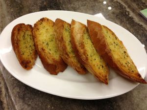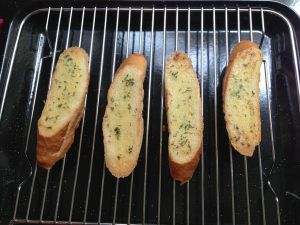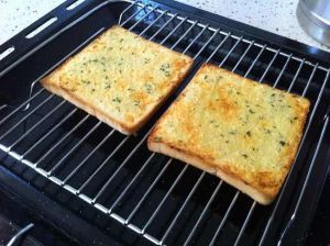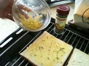 将蒜蓉、法香、食盐与融化了的牛油均匀搅拌,涂上吐司上。