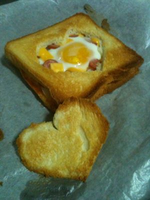 涂上黄油、番茄酱。铺上洋葱、香肠、鸡蛋、芝士、黑椒粉等。