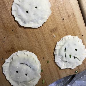多了点面,里面放了点肉和葱,做成了笑脸饼