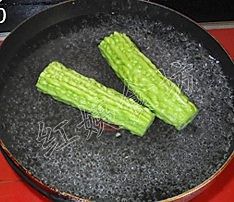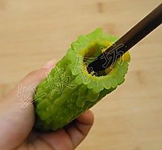 苦瓜洗净后从中间切开,用筷子将中间的瓜瓤去掉。 锅中水烧开,放入苦瓜焯2分钟(苦瓜焯水可去除部分苦味;还可使苦瓜的颜色更漂亮;还可以去除部分草酸,草酸可妨碍食物中钙的吸收)。