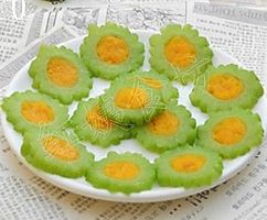 直至用南瓜泥将苦瓜填满,余下的半根苦瓜也填满南瓜泥。 用刀将苦瓜切成均匀的片,即可享用。尽量切的厚一些,不然南瓜泥会与苦瓜分离。