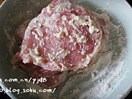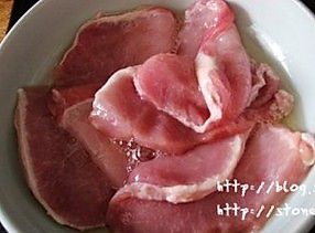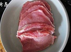 把肉切成大厚片。我切的厚度大概在5毫米。里脊片一定要拍松,否则煎的时候肉片会卷曲,影响美观,我今天的就没拍松,下次要注意了。