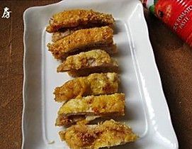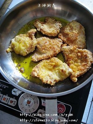 锅里加油,烧热,肉片先蘸蛋黄液,然后再蘸面包糠,下锅小火煎,火大了外面的面包糠糊了,里面的肉还没有熟。我现在用的炒锅,锅底很厚,导热均匀,超好用。