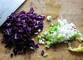 切一些葱花和姜片。紫甘蓝是做配菜的,目的就是想让儿子多吃点蔬菜。