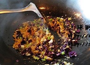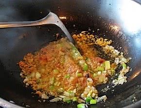 锅里加油,油热后下葱花和姜片爆香,然后把鱼籽扔进去炒散。