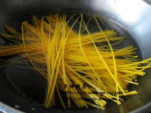 锅里加水,把玉米面条下到锅里,煮五分钟。凉水下锅就可以。还可以事先把玉米面条泡软,然后开水煮一分钟。