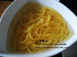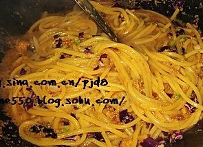 把面条捞出来沥水,扔到锅里和鱼籽混合,这个过程很短,炒一分钟就可以了。