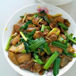 五花肉和姜片一起煮到九分熟,切薄片,蒜苗切段。放一点油热锅后放五花肉多炒一下会出很多油的。肉差不多好了就放适量豆瓣酱,一点酱油香了之后放蒜苗和粉粑粑。起锅前放一点盐,吃得淡的可以不放了因为豆瓣酱就挺咸的。