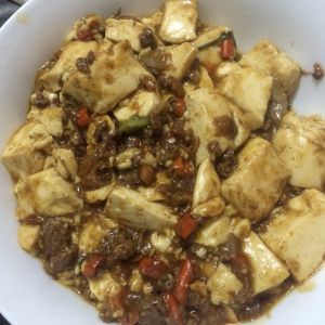 加牛肉末进锅里,加点水后放切好的豆腐方块进去,熟了放点淀粉加水煮熟就可以出锅了