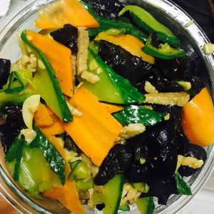 木耳➕黄瓜片➕胡萝卜下锅。翻炒➕少许鸡精