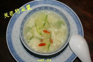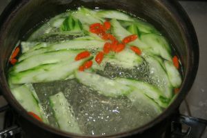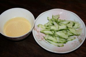 小黄瓜去皮切片,枸杞子洗净;一茶匙面粉,打入一个鸡蛋后充分打散;