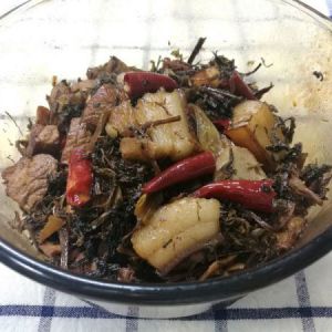 新鲜猪肉(五花肉更好)洗净,切成长宽约2~3厘米,厚度约1厘米的块状,生姜去皮切片,大葱切小段,干辣椒切成2厘米左右长度;梅干菜用水浸泡(约1小时)