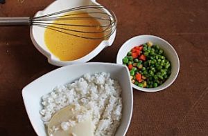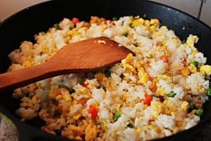 把米饭倒进去继续炒,炒到米饭吱吱作响,有米粒往外蹦就算好了。