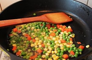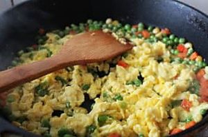 锅里加油,烧热,下豌豆炒熟,这个豌豆已经是八分熟的了,很容易就炒好。油要多加一些,因为炒鸡蛋很费油。