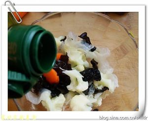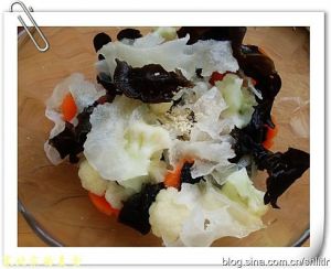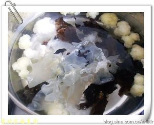 把银耳、黑木耳提前泡发,洗净,掐去根部,撕成小朵。放开水锅中焯水,捞出备用