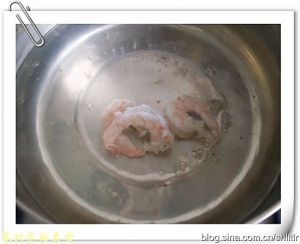 大虾去头、壳,剔除虾线,放开水锅中煮熟,捞出,切成段,备用
