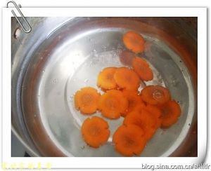胡萝卜去皮,洗净,切薄片也焯下水,捞出。